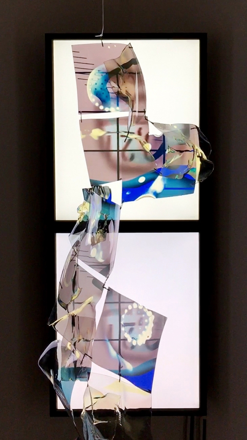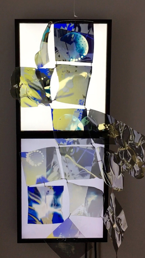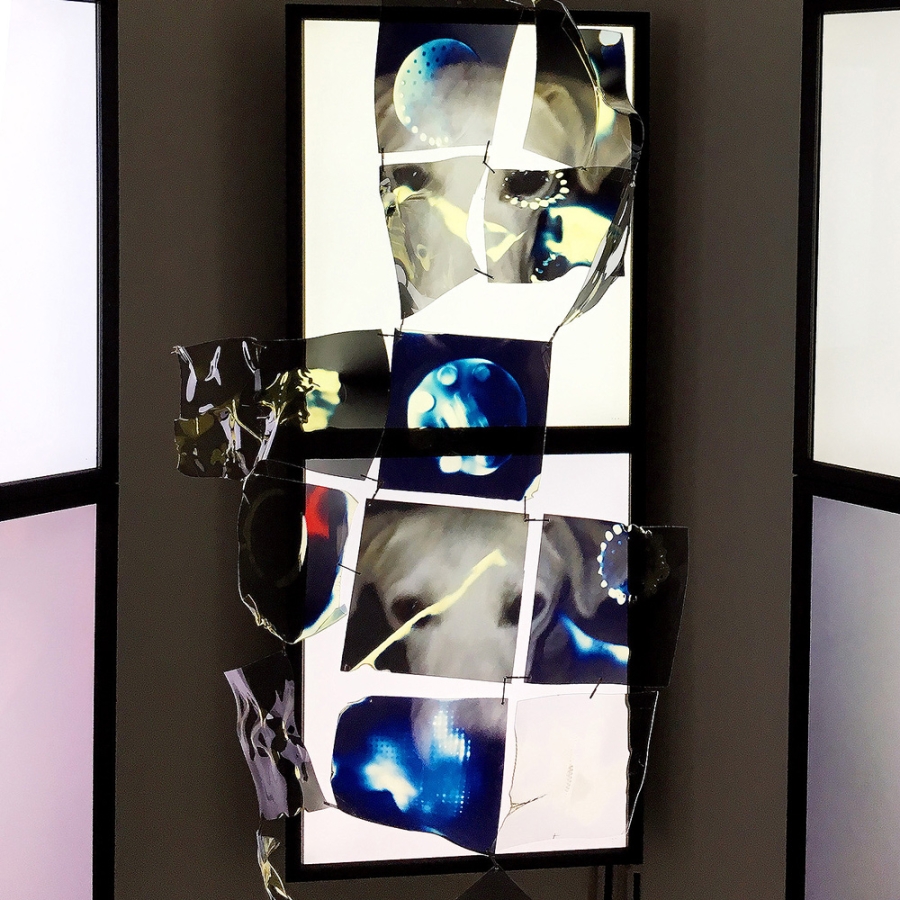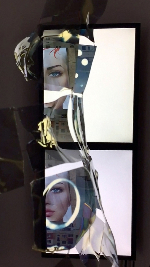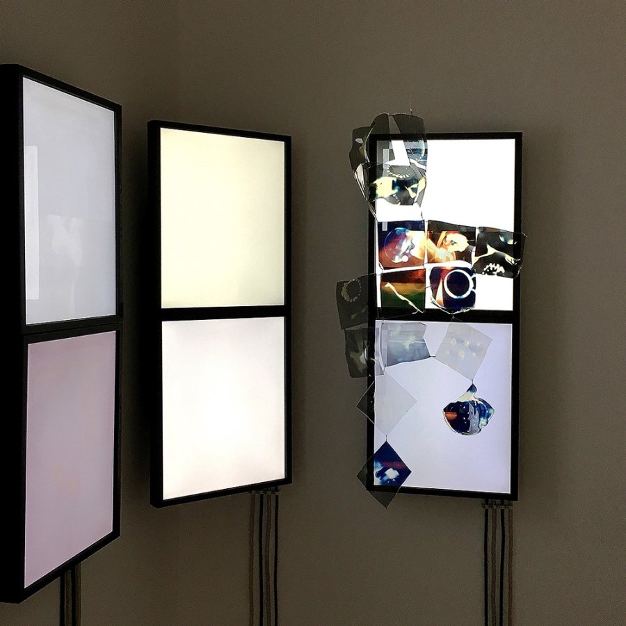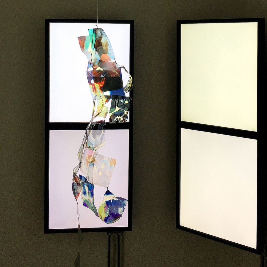 Material- und Mediums-Dekonstruktion. Unsichtbare Bilder auf bearbeiteten Bildschirmen werden durch spezielle Folien sichtbar gemacht, die als Mobiles, angetrieben von Quartz-Uhrwerken vor den industriellen Objekten hängen. Sie geben prismatische Einblicke auf Videocollagen alltäglicher visueller Eindrücke, Lichter, Formen und Farben, die in Fotos, Videos und digitale Grafiken gebannt wurden.